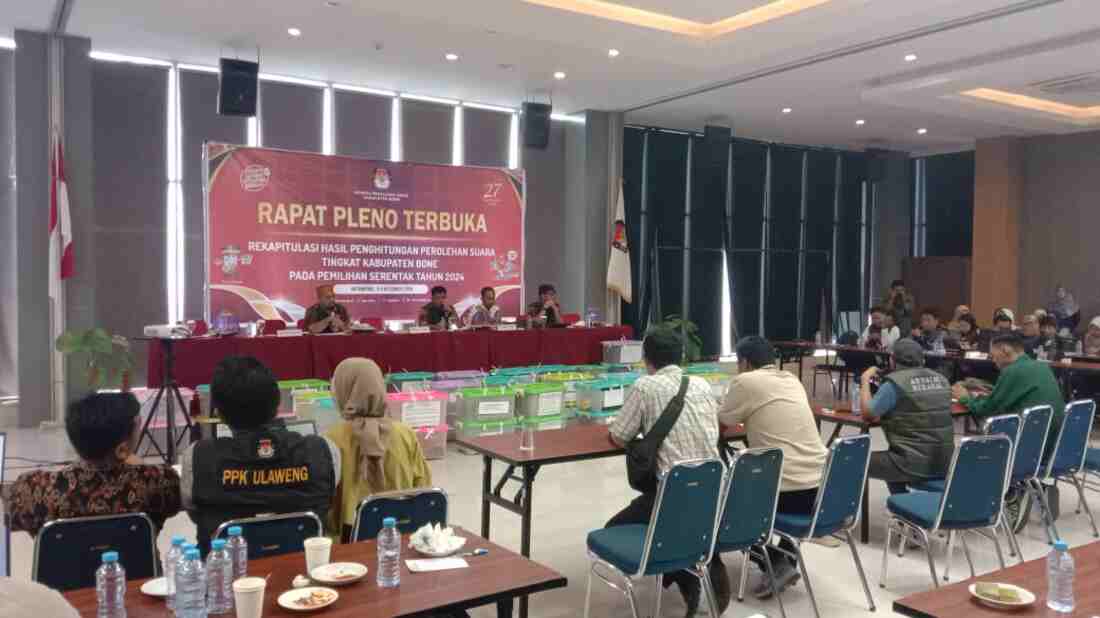 BONE. — Komisi Pemilihan Umum (KPU) Kabupaten Bone melaksanakan rapat pleno terbuka rekapitulasi hasil penghitungan perolehan suara tingkat kabupaten bone pada pemilihan serentak tahun 2024 di Hotel Novena, Selasa 3 Desember 2024.