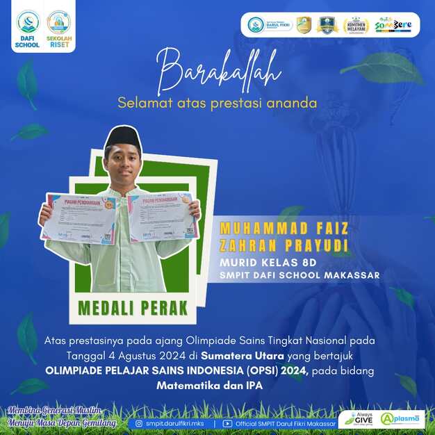 Sulsel.99news.id,Makassar – Satu lagi prestasi gemilang diraih oleh siswa SMPIT Darul Fikri Makassar dalam ajang Olimpiade Sains Tingkat Nasional (OSN) yang dilaksanakan pada tanggal 4 Agustus 2024. Muhammad Faiz Zahran Prayudi, siswa kelas 8D, berhasil meraih medali perak dalam cabang lomba Matematika dan IPA, sebuah pencapaian yang membanggakan bagi sekolah dan kota Makassar.