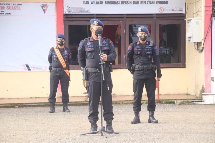 Komandan Batalyon (Danyon) C Pelopor Sat Brimob Polda Sulsel Kompol Nur Ichsan, S.Sos., M.Si memimpin langsung pelaksanaan apel pagi di Lapangan Mako Batalyon C Pelopor, Senin (12/12/2022).