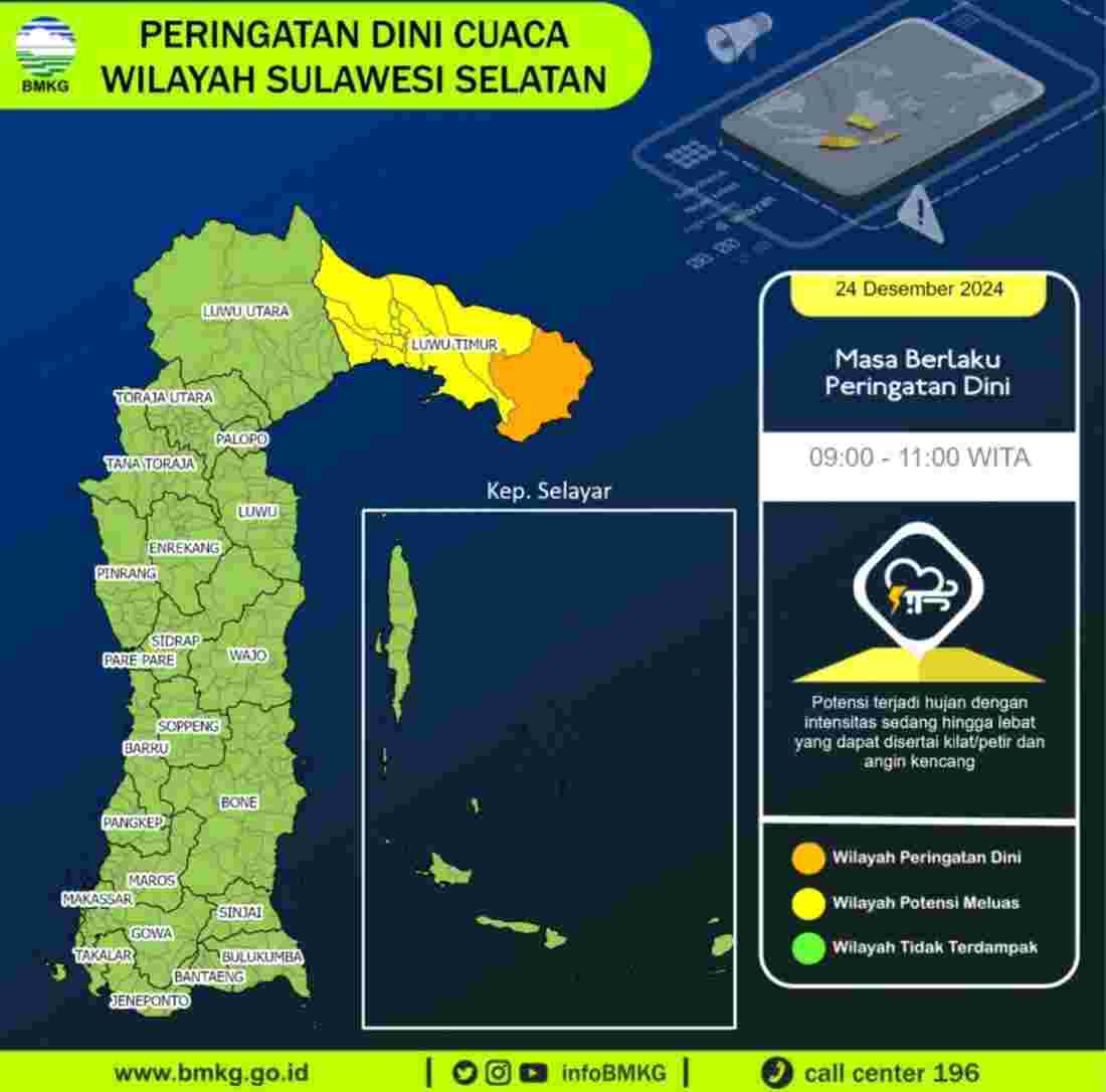 Gambar prakiraan cuaca BMKG Makassar, peringatan dini cuaca wilayah Sulsel masa berlaku 09.00 - 11.00, Selasa (24/12/2024). (Foto: Ist)